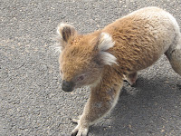 This weekend we drove along a very narrow road surrounded by eucalyptus trees! Suddenly we came upon a koala just sitting still about one foot away from us on a dead tree trunk, seemingly posing for us! We watched in amazement as he stayed there for quite some time, oblivious to the circle of people around him. Then he slowy sauntered backwards down the trunk and rooted around the bushes a bit. He seemed rather disoriented and had an injury on one of his legs. Suddenly he changed direction and came right out onto the open road, not half a foot away from us! He headed right for Rick. While others stopped the oncoming cars, we spoke to him gently and guided him across the road to the other side. It was as if he understood that we were trying to help him! Or, maybe it was just that koalas can't see very well, and he didn't notice us! Anyway, we could have reached out and touched him - that's how close we were! Simply incredible! Enjoy the pictures!!